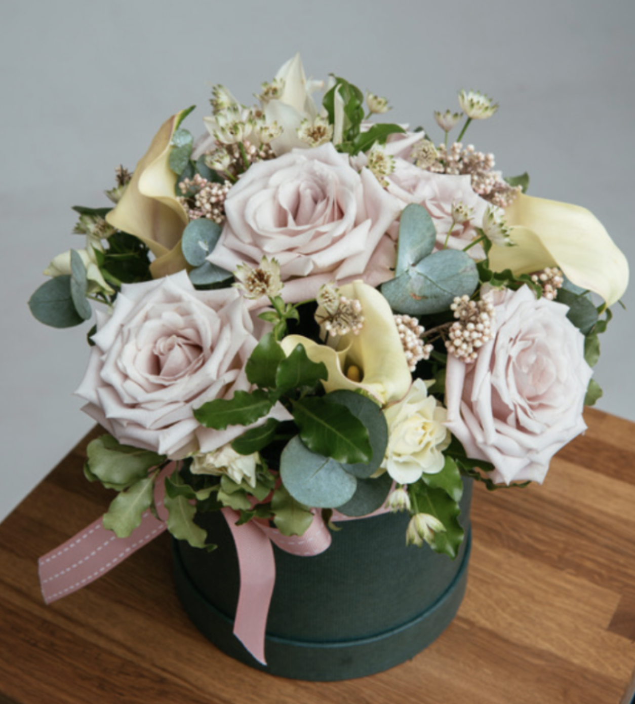 A decorative arrangement of freshly cut flowers, displayed in a vase, hat box...