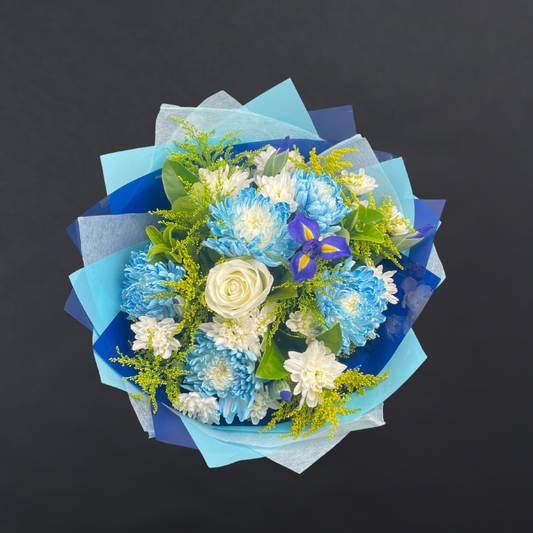 Blue Horizon Bouquet With Dyed Disbuds, Iris, Rose and Golden Rod
