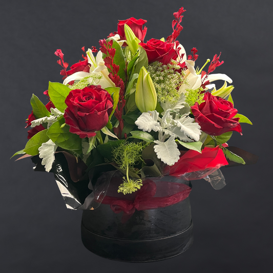 Elegant Columbia Roses With Oriental Lilies Collection- RED - 5 STEMS